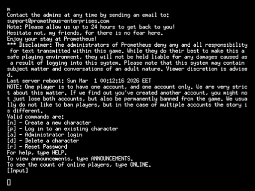 Custom Hack and Slash Fantasy English Speaking Server located in United Kingdom. Runs lpmud LDMud 3.5.8 (3.5.8). Online for 35 years. For players age 16 or older.